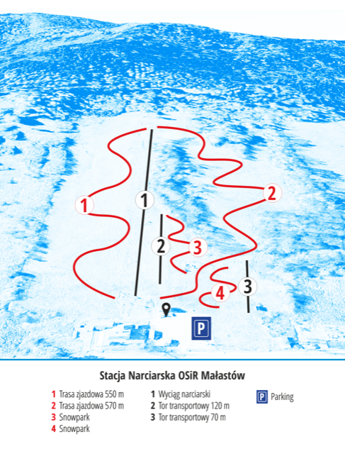 Oba tory dla początkujących do nauki jazdy na nartach i snowboardzie, różnica poziomów 21m. Oba tory działają w obrębie snow parku zlokalizowanego w dolnej części stacji narciarskiej w Małastowie dostępnej bezpośrednio z parkingu. Dla użytkowników na terenie stacji narciarskiej funkcjonują: wypożyczalnia sprzętu narciarskiego, ski serwis, szkółki narciarskie. Przy dolnej stacji wyciągu usytuowany jest parking dla 100 samochodów.